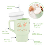 Vaso Entrenamiento My 1st Tumbler Bunny Este vaso de 266 ml está diseñado especialmente para bebés que empiezan a beber solos. Fabricado con silicona 100 % premium, es liviano y suave al tacto, ideal para manos pequeñas. Incluye una bombilla antiderrames de dos piezas con válvula inteligente que evita fugas, incluso si el vaso se vuelca. La boquilla de silicona es delicada para los primeros sorbos. Cuenta además con un asa integrada para transportarlo con facilidad y un diseño compatible con la mayoría de los portavasos. Su limpieza es práctica: apto para lavavajillas o lavado a mano.