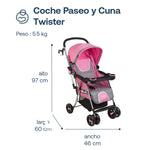 Coche Paseo y Cuna Twister SX Rosa El práctico coche Twister es ideal para hacer los paseos más cómodos, con su opción de cambiar el manilla de dirección puedes quedar frente a tu bebé o que el vaya mirando el paisaje. Lo otro que lo caracteriza es que su asiento es completamente abatible, haciéndolo perfecto para tomar siestas en todos lados.