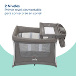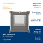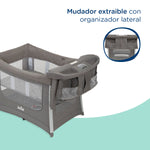 Características TécnicasTodo lo necesario para que tu bebé descanse y duerma. Este diseño compacto resulta ideal para espacios reducidos. Solución ultra compacta para dormir y jugar en viviendas pequeñas. El cambiador se levanta y guarda en el compartimento lateral y el lujoso organizador con almacenaje mantiene todo lo esencial al alcance de los padres. Fácil montaje y plegado en segundos con unos simples botones.