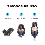 El asiento de automóvil 3 en 1 crece con su hijo desde el arnés orientado hacia atrás (5-40 lb) hasta el arnés orientado hacia adelante (22-65 lb) hasta el elevador de respaldo alto (40-100 lb) Características - Graco ProtectPlus Engineered™: una combinación de las pruebas de choque más rigurosas que ayudan a proteger a su hijo en choques frontales, laterales, traseros y vuelcos Medidas: