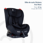 Silla de Auto Convertible Ara Next Negro La Silla de Auto Convertible Ara Next brinda seguridad y comodidad desde el nacimiento hasta los 25 kg. Su funda desmontable y lavable, junto con protectores de hombros y arnés ajustable, aseguran un viaje cómodo y seguro. Con múltiples posiciones de reclinado, adapta perfectamente a las necesidades de tu bebé en cada etapa.