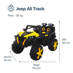 Camioneta All Track Amarillo La Camioneta All Track transforma cada paseo en una aventura inolvidable. Equipado con una batería de 12V, MP3 y radio, ofrece entretenimiento continuo. Con control remoto y un espacioso asiento para dos niños, brinda una experiencia cómoda y segura. Las ruedas extra grandes con amortiguación permiten un manejo suave en todo terreno. Fabricada con materiales de alta calidad, garantiza durabilidad y muchas horas de diversión para tus pequeños.